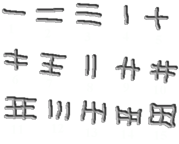 Das Zähl- und Zahlensystem der Zreunokt und Gekn basiert auf der Zahl vier, was der Zahl der Finger und Zehen pro Hand bzw. Fuß dieser Völker entspricht. Auch wichtig ist die 16 (da vier mal vier). Ein waagerechter Strich bedeutet eins, ein senkrechter Strich vier. Jede Zahl hat maximal drei Striche jeder Art. Die Zahlen von eins bis 15 sehen also folgendermaßen aus: ![]() Für Zahlen ab 16 aufwärts gibt es zwei verschiedene Systeme: Das erste verwendet weitere Symbole, von denen wiederum maximal je drei pro Zahl verwendet werden dürfen: einen Kreis (der um die übrigen Zahlenteile gezeichnet wird) bedeutet 16 und ein Quadrat (welches wiederum außen um evt. Kreise geschrieben wird) steht für 64. Aus alter Zeit überliefert, heutzutage jedoch kaum mehr gebraucht sind ein Sechseck und ein Dreieck die 256 bzw. 1024 darstellen. Diese Zahlenschreibweise wird vor allem dann gebraucht wenn man nur relativ kleine Zahlen schreiben will ohne mit ihnen zu rechnen. Die zweite Methode benutzt mehrere Ziffern, die jeweils einen Wert von null bis 15 einnehmen können. (Als Null wird ein diagonales Kreuz verwendet, die übrigen Ziffern sehen so aus wie in der obersten Abbildung.) Dabei ist jeweils die nächstgrößere Ziffer 16mal soviel wert wie die vorherige, genauso wie im Dezimalsystem die nächstgrößere Ziffer jeweils 10mal mehr zählt. ![]() Die Ziffer ganz links ist 6x16x16=1536 wert, die mittlere Ziffer 15x16=240 und die Ziffer ganz rechts nochmal 3. Zusammen ergibt dies 1536+240+3 = 1779. Diese zweite Methode wird vor allem dann verwendet wenn mit den Zahlen gerechnet werden soll, oder wenn die Zahlen so groß werden daß sie sich mit Kreisen, Quadraten etc. nicht mehr schreiben lassen. |